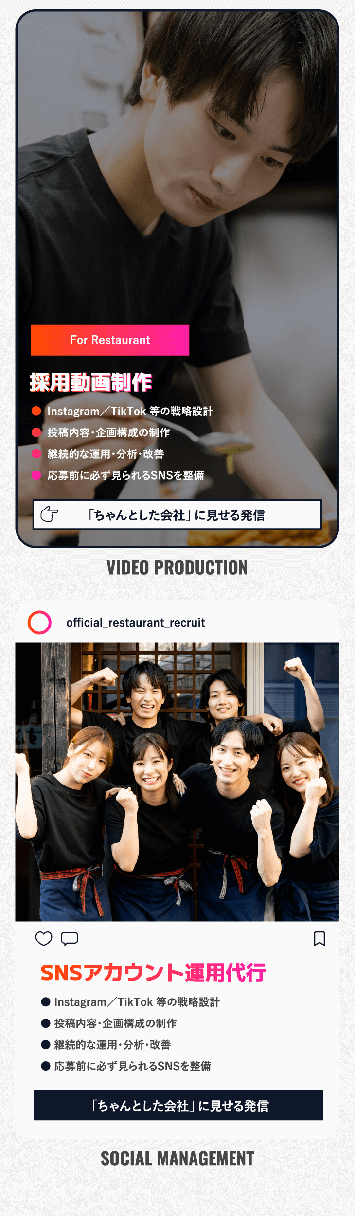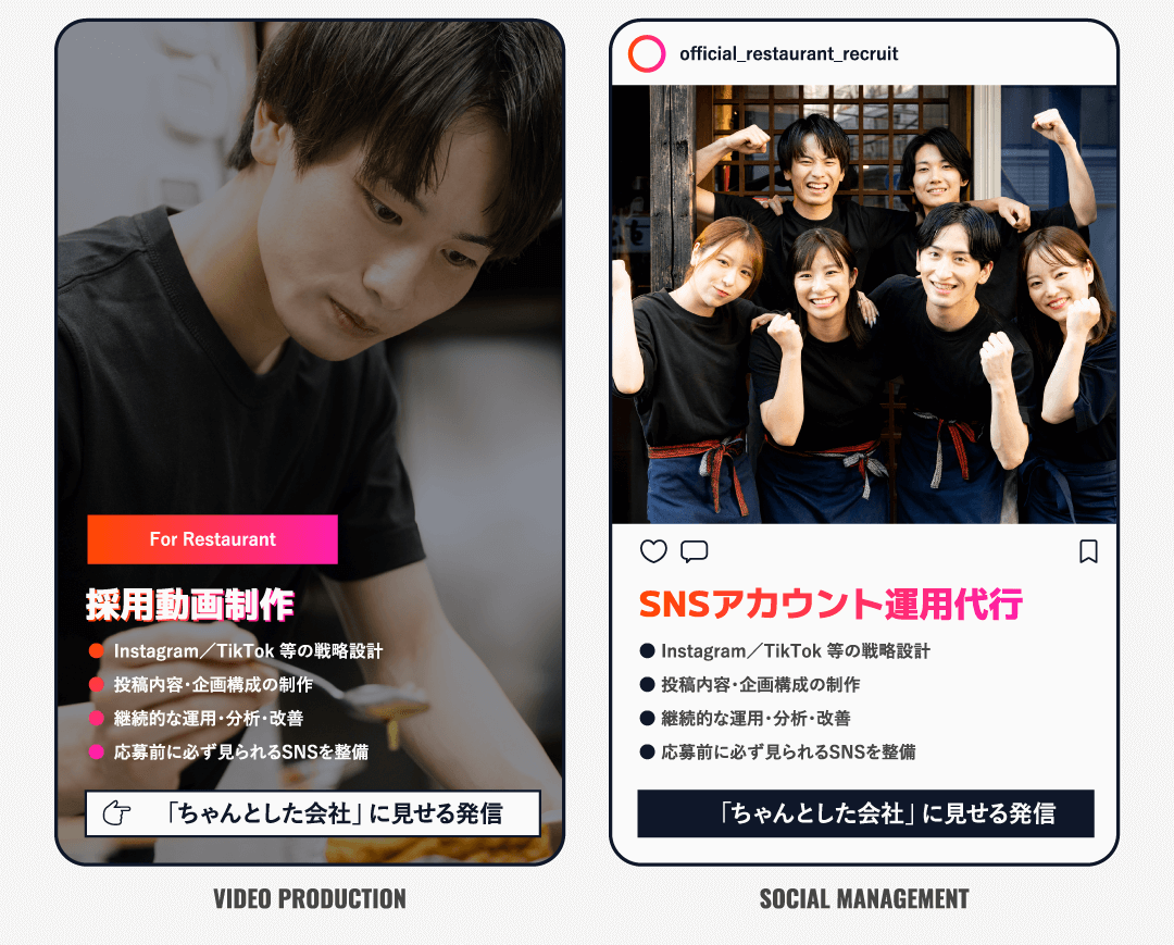 私たちは動画制作会社でもSNS代行会社でもありません。採用につながる発信を”継続して回す”ところまで任せるサービスです。