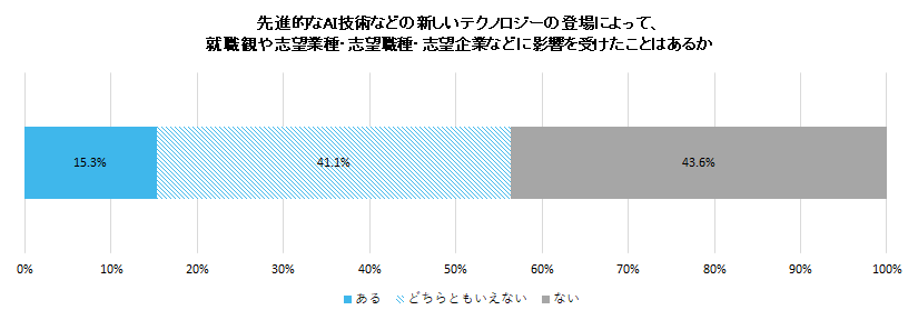 上記調査によれば、先進的なAI技術などの「新しいテクノロジーの登場が就職観や志望業種・職種・企業選択に影響した」と回答した学生は15.3%に達しています。これは回答全体の中では少数派ではありますが、学生の一部にとって、テクノロジーの進展が意思決定に影響を及ぼしていることを示しています。
