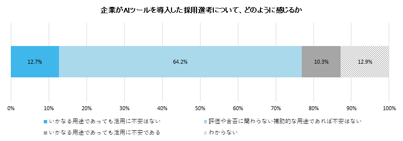 上記調査によれば、企業が採用選考にAIツールを導入しているケースについて、「評価や合否に関わらない補助的な用途であれば不安はない」と回答した学生は64.2%と最も多い結果となっています。一方で「いかなる用途であっても活用には不安である」と回答した学生は10.3%にとどまっており、全体としては限定的な活用であれば受け入れる姿勢を示す学生が多い状況がうかがえます。