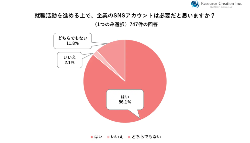 同調査によると、就活生の86.1%が「企業のSNSアカウントは必要である」と回答しており、求人媒体や企業ホームページで得られる情報だけでは十分ではないと考える学生が多いことが示されています。