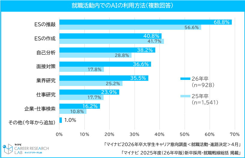 このような状況について、マイナビが公表している「新卒採用・就職戦線総括(2026年卒)」によると、就職活動において生成AIを利用した経験がある学生は66.6%に達しています。この結果から、生成AIの利用は一部の学生に限られた取り組みではなく、一定の広がりを持った行動として捉えられます。